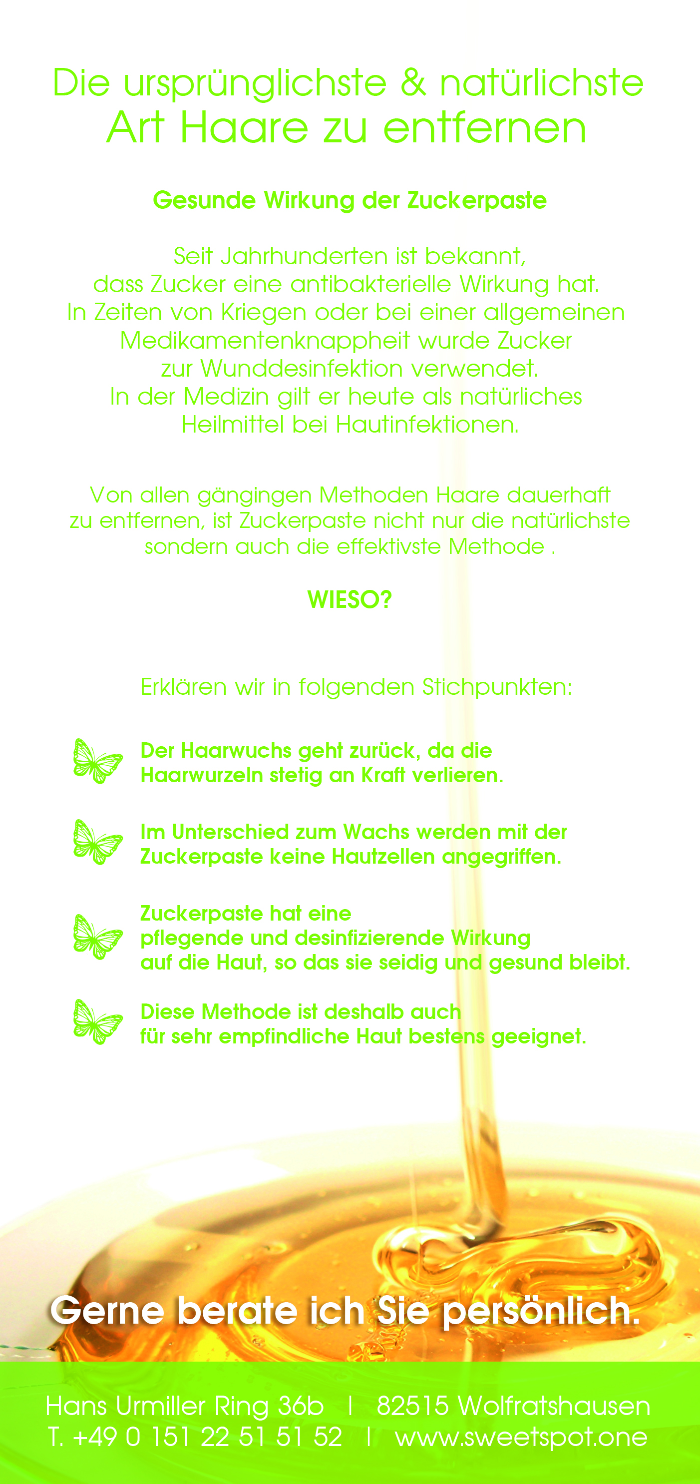 Tatiana Litschik begrüßt Ihre Gäste ich begrüße euch herzlich auf meiner Internetseite. Mein Name ist Tatjana Litschik. Mit Sugaring als sanfte, jahrhunderte bewärte und natürliche Methode, die "lästigen" Härchen gründlich bei Mann und Frau an allen Körperregionen zu entfernen helffe ich dir zu einem guten Körpergefühl.